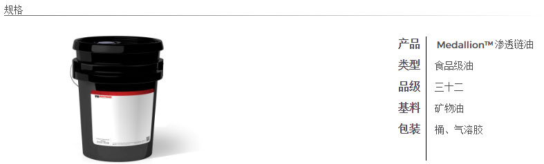 Medallion™渗透链条油是一种多用途的轻质润滑油,可用作可能与食用产品接触的设备和部件上的润滑剂,渗透油和防锈膜。 它是H-1和Kosher批准的NSF注册。 奖章穿透链油非常适合在-40°F(-40°C)至180°F(80°C)温度下运行的输送链上使用。